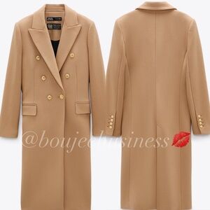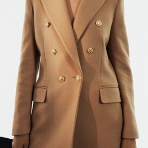 Lapel collar and long sleeves. Flap pockets at front. Back vent. Front double breasted metal button closure. 75% wool 25% polyamide