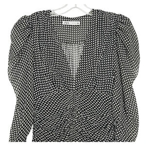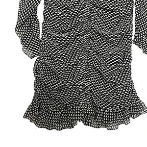 Zara Sheer Black & White Pattern All Over. Ruched Mini Dress. Slight LIned Waist Down. Puff Shoulders, Long Sleeves. Deep V-Neck. Silhouette Fit. Hidden Side Zipper. Ruffle Hem.