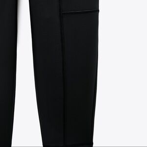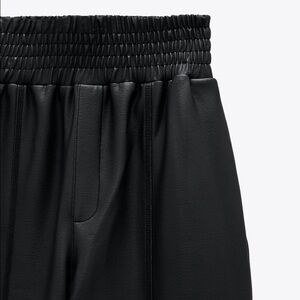 High-waisted pants with elastic waistband. Side pockets. Pronounced seam detail. Color: Black
