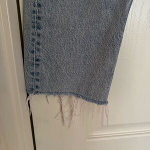 Faded high-waist jeans with a straight-leg and five-pocket design. Featuring seamless hems and button fastening. Raw hem and distressing details throughout. 100% cotton. Size 6.