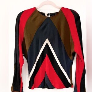 EUC Stylish Zara blouse with bold chevron pattern. Features red, blue and brown colors. Long sleeves and round neckline. Perfect for a chic look. Back button.