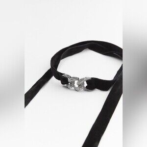 Velvet choker. Metal link detail with rhinestone appliqué. Tie closure.