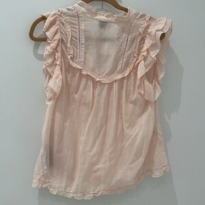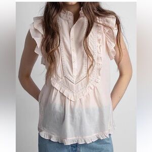 Elegant pink blouse with delicate ruffles and lace detailing. Perfect for a chic and feminine look.