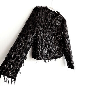 Zara Black Button Up Sequin Fringe Jacket Size Medium