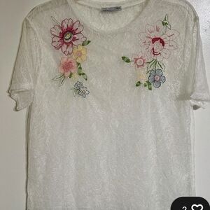 This Zara t-shirt showcases a cream lace base adorned with pink floral embroidery, offering a romantic and feminine appeal. The short sleeves and rounded neckline enhance its classic style, while the embellished details add a touch of elegance. Ideal for elevating your everyday wardrobe with a pop of color.