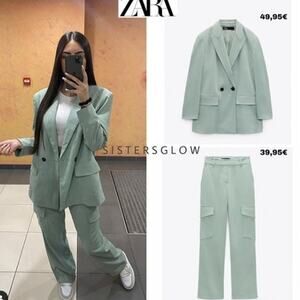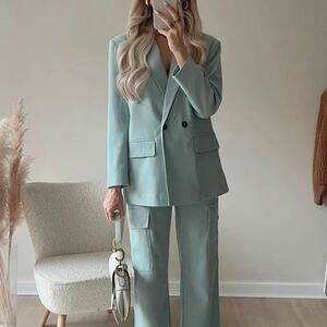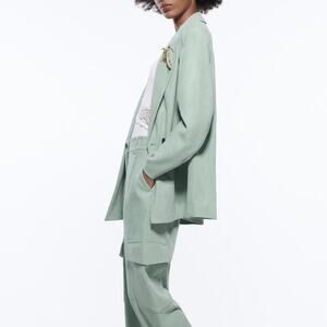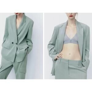 Zara Double Breasted Soft Oversized Blazer Jacket Light Green Shoulder Pads