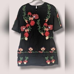 Zara Floral Birds Embroidered Silk Blend Tiered Mini Dress Feminine Bohemian