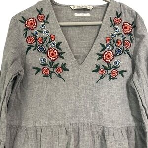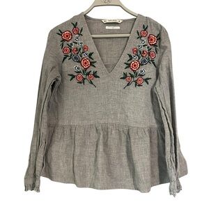 Chic gray blouse with vibrant floral embroidery. Features a flattering V-neck and long sleeves. Perfect for casual outings.