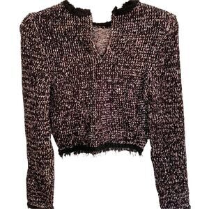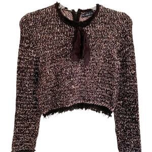 Black with pink, white boucle knit sweater. Bow adorned neck. Hidden quarter back zip close. Eyelash fringe hem. Size Large. NWOT. Bloggers Fave. Retail = $85