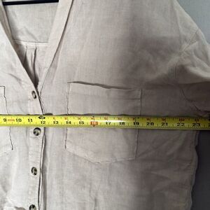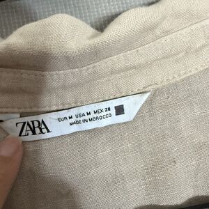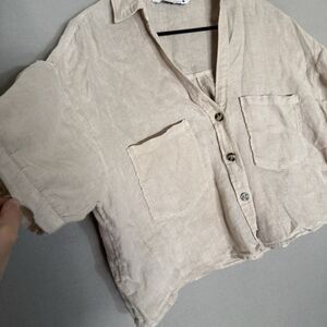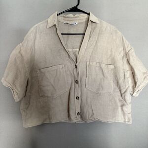 Zara Linen Top Medium Beige Womens Cropped Short Sleeve Boxy Button up Collared