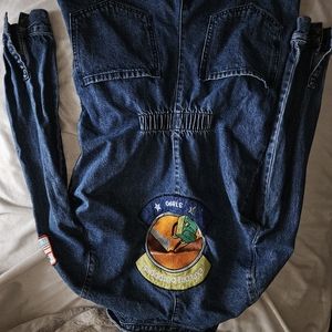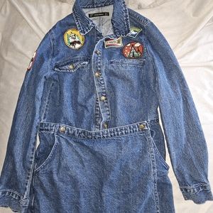 Denim romper with patches and crossover wrap.