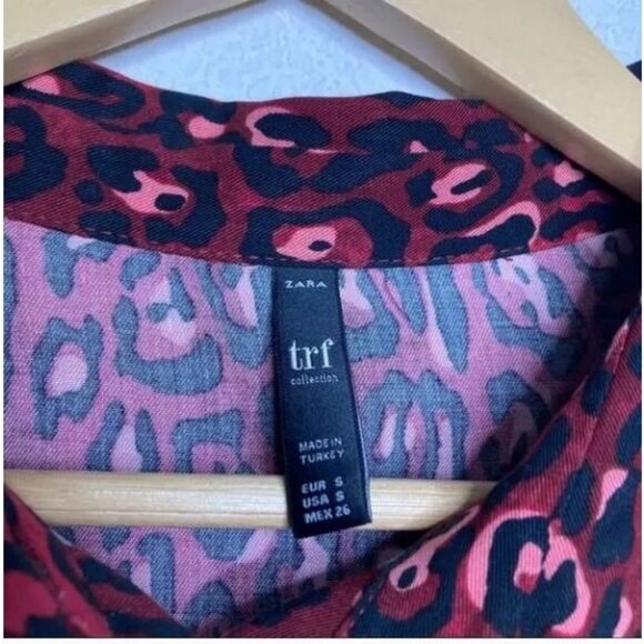 This Zara TRF cropped blouse features a bold red and pink leopard print, tailored from soft viscose, providing a stylish and comfortable fit. The buttoned cuffs and classic collar add a touch of sophistication, making it a versatile piece for various settings.