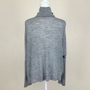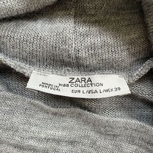 Gorgeous Zara W&B Collection fine knit gray melange long sleeve turtleneck top with a roll neck and a sheer chiffon style panel front with a really beautiful floral print in shades of fuchsia, rust, blue, green, gray, and tan against a black background. Size L. Some very light wear to the floral print. Really lovely on.