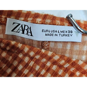 Zara Women Midi Straight Skirt - Size Large - Orange White - Gingham - Ruched - High Slit - Pull On - Beach
