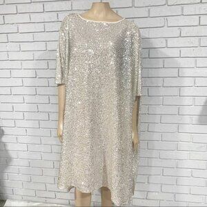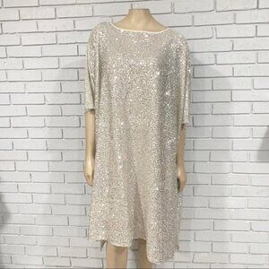 Cape with wide round neckline and short sleeves. Sequin appliqué. Color ecru. Size S-M. Outer shell 96% polyester and 4% spandex. Lining polyester.