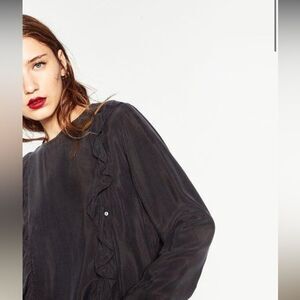 Zara black silky sides ruffles blouse. Premium collection. Side hidden buttons. Size small. Boxy fit. EUC