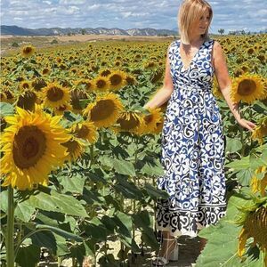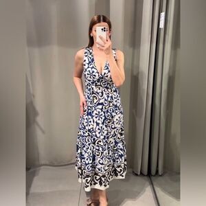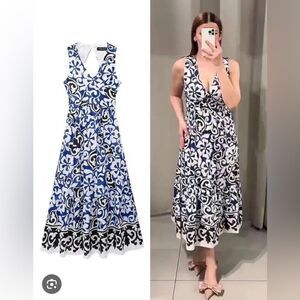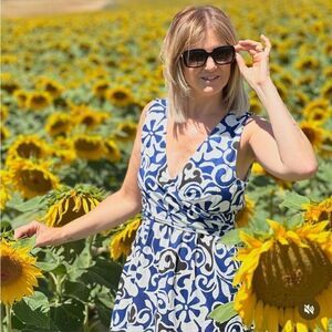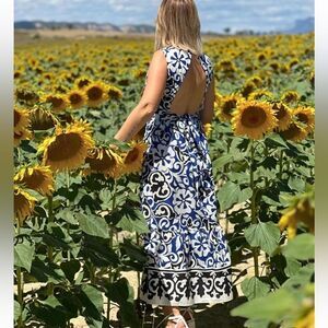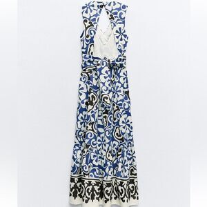Sleeveless V-neck dress. Wrap front waist with bow and open back.