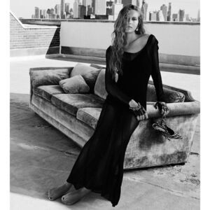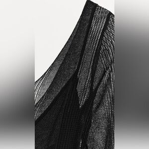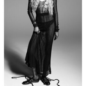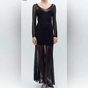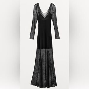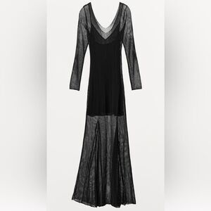 Long dress with V-neck and long sleeves. Openwork fabric. Tonal interior lining.