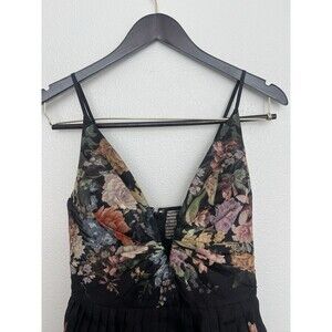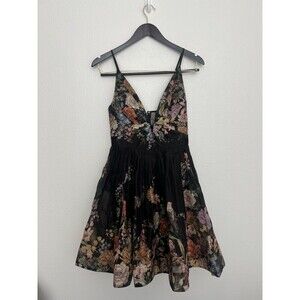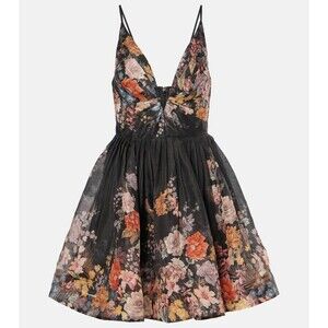 Zimmermann Pavilion V Neck Mini Dress in Black Multi Floral Linen Silk AU 1 US 6