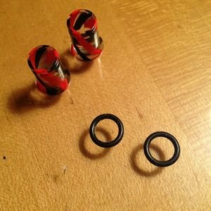 black and red swirl gauges with a clear center that is solid. they have the black band backings both included. size zero
