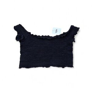 black textured, bikini top, summer swimwear, ruffled detail, cropped swimsuit, beachwear, textured fabric, small size, trendy swim top, fashionable bikini