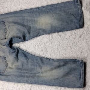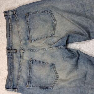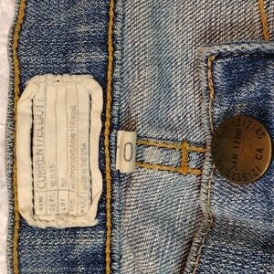 Current/Elliott The Mississippi Destroy The Skinny Boy Women's Blue Light Wash Five Pocket Button/Zipper Front Closure Distressed Cut Out High Rise  Cropped His Skinny Jeans. 98% Cotton, 2% Spandex. Worn Look. Measurements approx. Flat Lay. Waist: 17, Rise: 10, Hips: 19, Inseam: 22. Size 27.