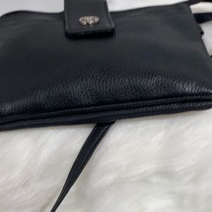 Leather Giani Bernini Crossbody. Width 5.5 inches, length 7 inches, strap drop 51” zipper on the top, two spots inside, silver hardware