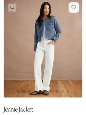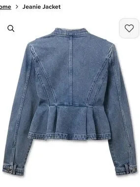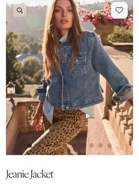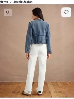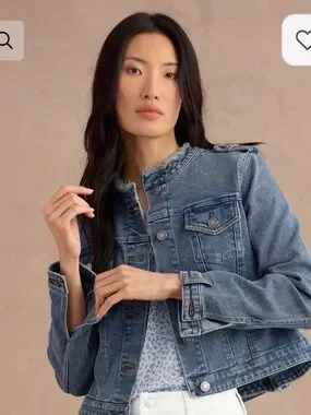 Classic cropped denim jacket from CAbi. Button-front with flap chest pockets. Subtle frayed collar detail. Clean, versatile blue wash. Easy layer over tees or blouses.