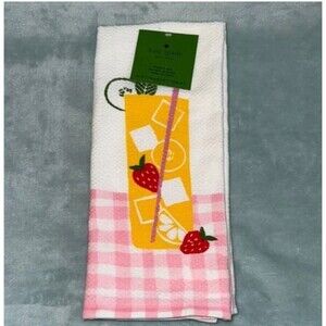 kate spade. Charming kitchen towel with pink and white checkered design. Features a vibrant yellow drink illustration with strawberries.