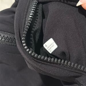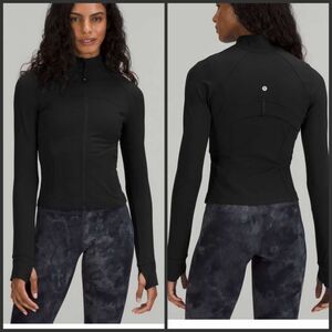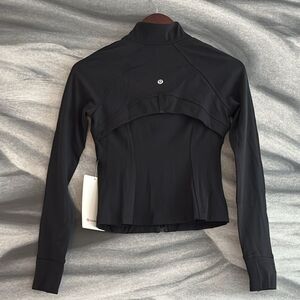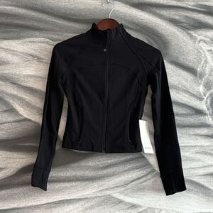 Sleek black top with full zip. Long sleeves and high collar. Perfect for active wear.