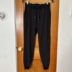 super cute & in good condition, no noticeable flaws. lightweight, comfortable, & stretchy luxtreme material throughout. mid rise, elastic stretchy drawstring waistband, front pockets, & is a jogger style. great to wear casually, everyday, to run errands, going shopping, school, gym, running, walking, hiking, camping, or whatever else you could think of!
