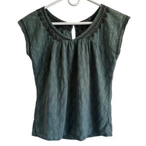 PrAna Blossom top in Starling Green. This has super cute embroidery along the sleeves and neckline, and a keyhole opening at the back. Size Small and in great preowned condition; no visible flaws.
