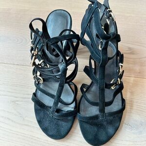 Strappy black suede sandals. Block heel. See photos for signs of wear.